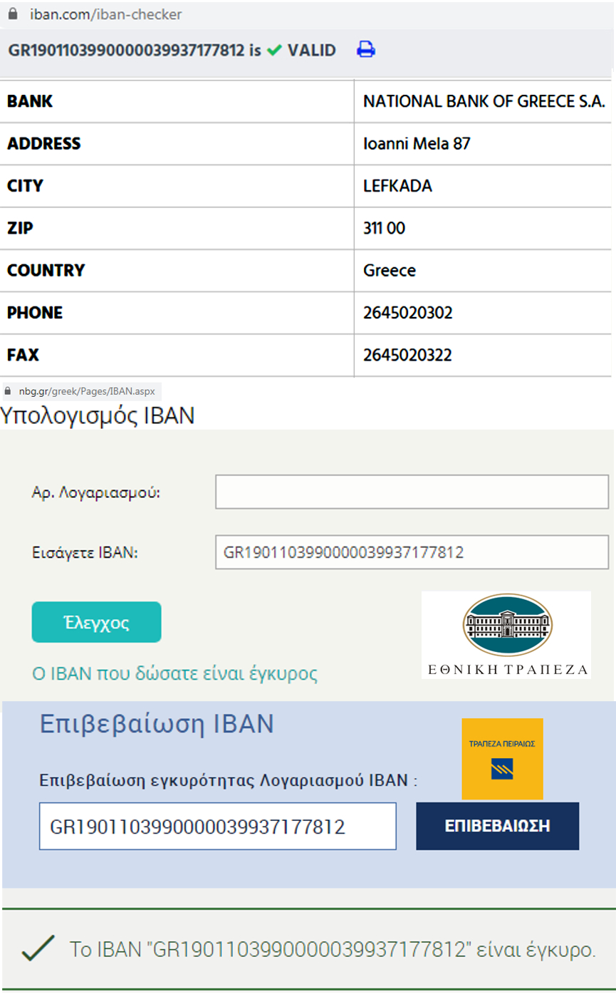 ΛΟΓΑΡΙΑΣΜΟΣ ΚΑΙ ΤΗΝ ΕΓΚΥΡΟΤΗΤΑ ΤΟΥ IBAN ΤΟΥ ΚΑΤΑΠΙΣΤΕΥΜΑΤΙΚΟΥ ΛΟΓΑΡΙΑΣΜΟΥ ΑΠΟ ΤΟ SITE ΤΟΥ «ΙΒΑΝ», ΤΟ SITE ΤΗΣ «ΕΘΝΙΚΗΣ ΤΡΑΠΕΖΑΣ» ΚΑΙ ΤΟ SITE ΤΗΣ «ΤΡΑΠΕΖΑΣ ΠΕΙΡΑΙΩΣ»